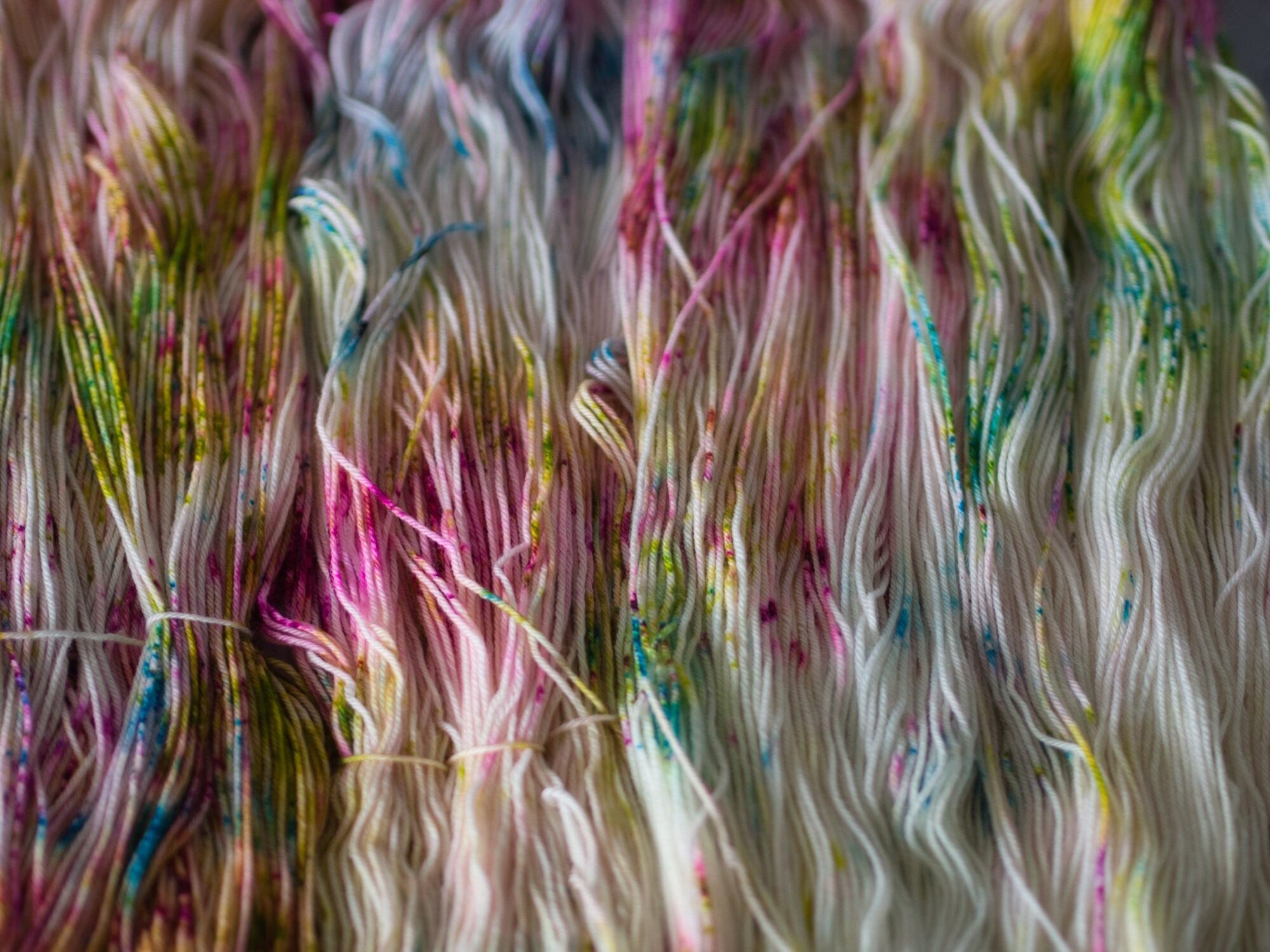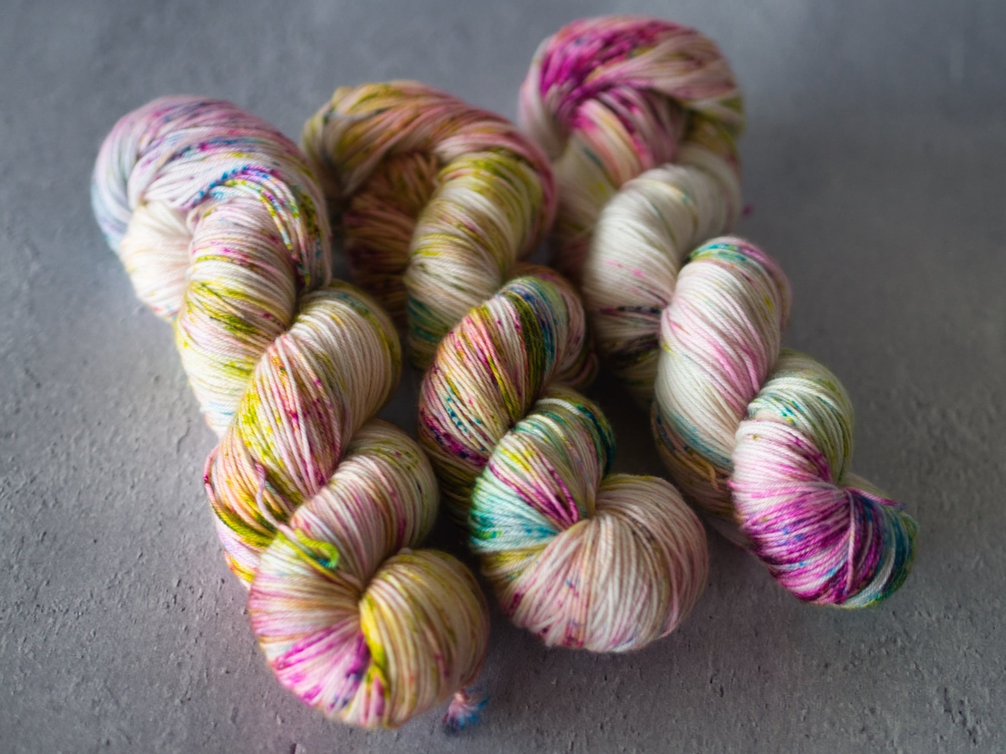 再販予定:なし 100g/400m 85% superwash extrafine wool 15% Nylon 1つの作品内で複数かせ使用する際には、手染め糸の特性上、プーリング等が起きてしまう可能性がありますので、なるべく1段(周)ごとにかせを交互に入れ替えて編むことをおすすめいたします。