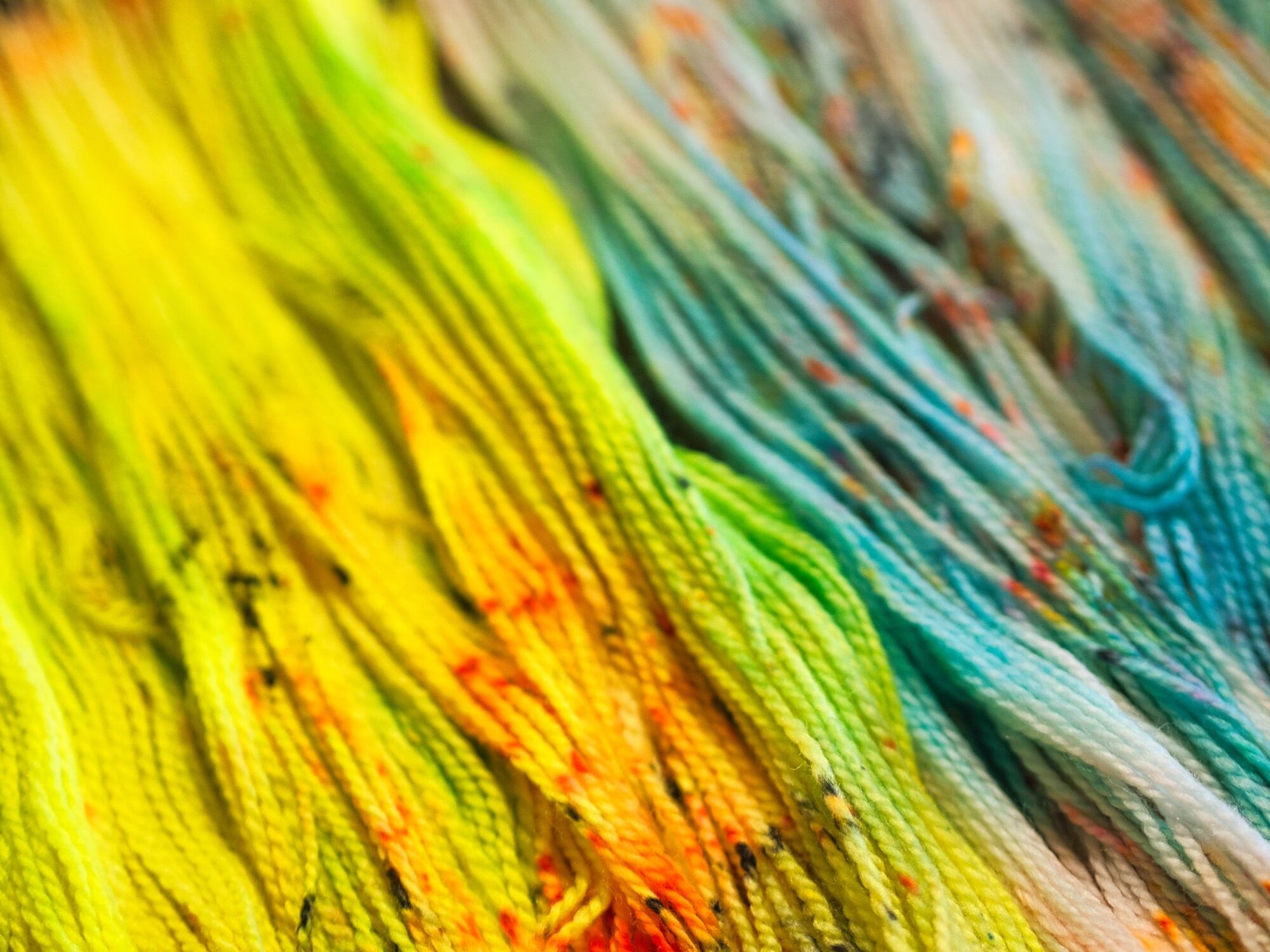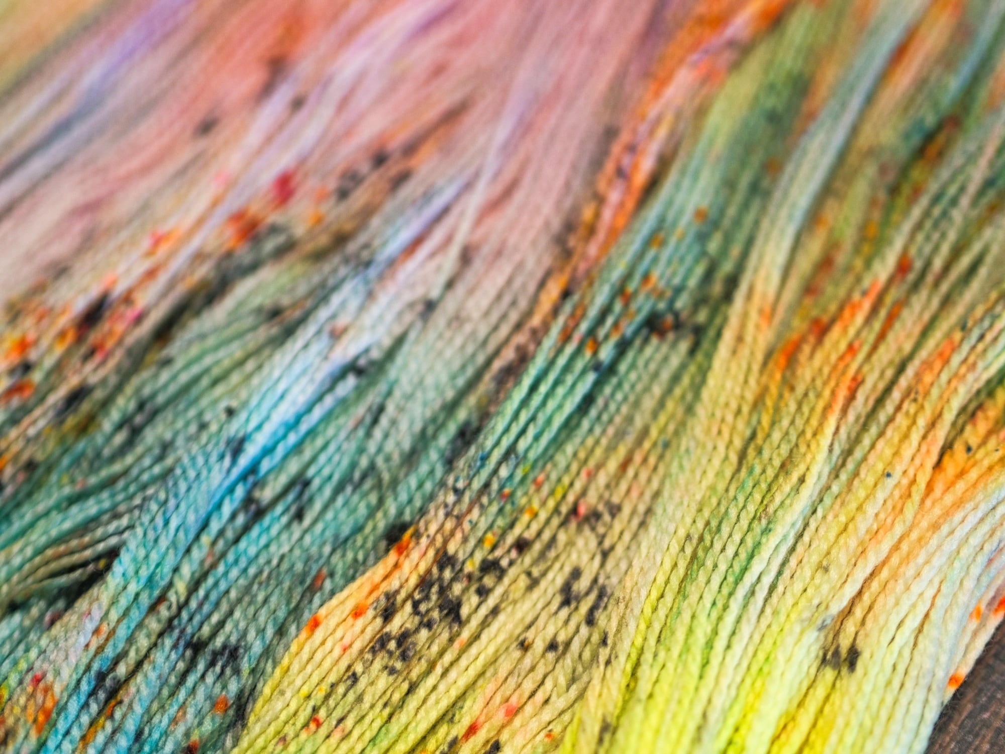 1つの作品内で複数かせ使用する際には、手染め糸の特性上、プーリング等が起きてしまう可能性がありますので、なるべく1段(周)ごとにかせを交互に入れ替えて編むことをおすすめいたします。